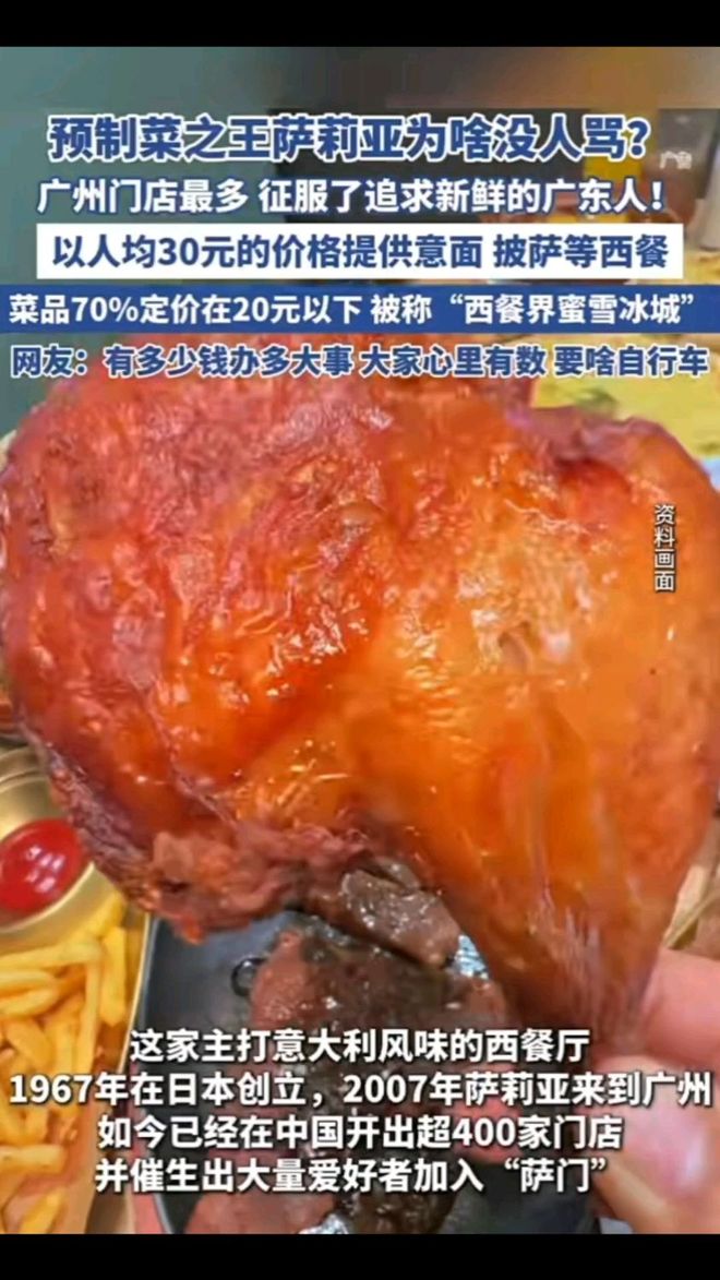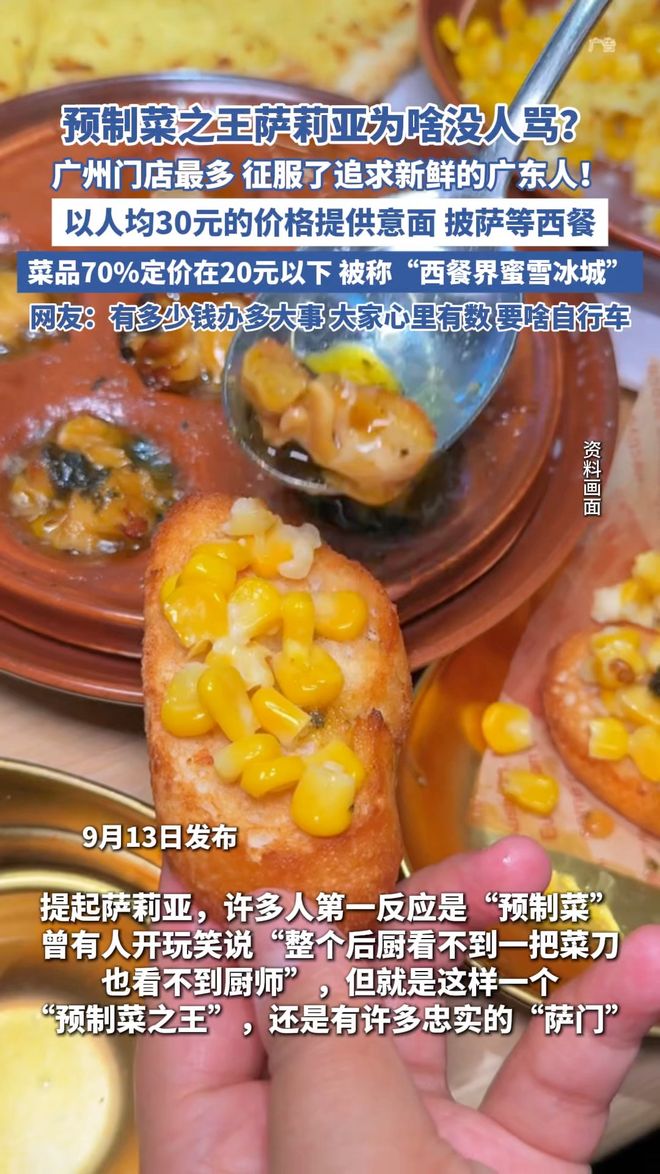 极致性价比,让消费者 “真香”萨莉亚能在预制菜争议声中独善其身,最直接的原因便是其极具杀伤力的价格优势。走进萨莉亚,就像走进了物价的 “时光隧道”。翻开菜单,你会惊讶地发现,100 道菜里,有 72 道价格在 20 元以下。16 元的肉酱意面,肉酱给得十分慷慨;10 元的奶油玉米浓汤,奶香浓郁;14 元的香肠小披萨,香肠分布均匀,芝士还能拉丝。饮料更是仅需 8 元就能无限畅饮。人均三四十元,就能在萨莉亚吃到撑,这样的性价比,在西餐领域乃至整个餐饮行业都难寻敌手。消费者向来是务实的,在物价不断攀升的当下,萨莉亚用低价策略精准击中了大众的消费心理。当花小钱就能享受一顿丰盛的西餐体验时,预制菜的身份也就变得不那么难以接受了。“人均 30,还要啥自行车啊”,这句网络热评生动地反映出消费者对萨莉亚价格的高度认可,在他们看来,以这样的低价品尝西餐,即便食材是预制的,也完全在可接受范围之内,甚至还觉得十分划算。西餐标准化的天然优势萨莉亚之所以在预制菜上没有引起太多反感,与其所属的西餐品类特息相关。西餐菜品如披萨、意面、牛排、沙拉等,原材料相对简单,加工制作步骤也不复杂,且消费者对其口味的追求较为统一。例如意面,大众普遍接受的就是番茄肉酱、奶油培根等几种经典口味,这使得预制菜在还原味道时难度较低,标准化生产后,口味差异不大,能够较好地满足消费者预期。反观中餐,八大菜系各有千秋,烹饪方式复杂多样,煎、炒、烹、炸、炖、煮、蒸、烤,每一种都有独特的技巧和火候要求,食材更是丰富繁杂。不同地区消费者的口味偏好天差地别,一道鱼香肉丝,在四川是正宗的麻辣酸甜,到了其他地区可能就需要根据当地口味进行调整,想要用统一的预制料理包满足所有消费者的味蕾,几乎是不可能完成的任务,这也难怪消费者对中餐预制化的接受度远低于西餐。
