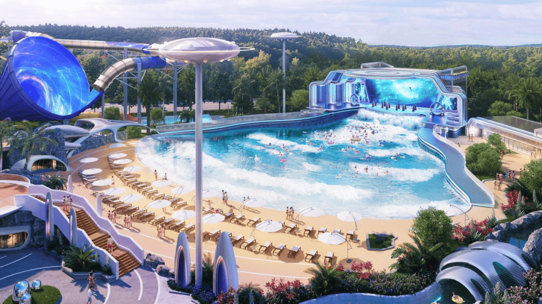杭州平行世界乐园综合体,位于超山风景区旁,由乐园、酒店、水乐园等三大版块组成,是一个集宋韵、演出、科幻、游乐、大型酒店、室内室外水乐园于一体的巨无霸文旅综合体,总投资约60亿。