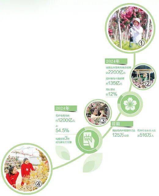 消费端的风吹草动,考验着供给端的应变能力。《报告》显示,2024年花卉电商消费约1200亿元,占全国花卉零售市场总规模的54.5%,电商连续3年成为增长主引擎,电商平台已成为小型观叶和观花植物盆栽的重要销售渠道。目前我国花卉种植面积已达125万公顷,花卉行业从业人员516万人。其中花农和种植工人等生产端人员占行业从业人员的较大比例,为50%—60%。